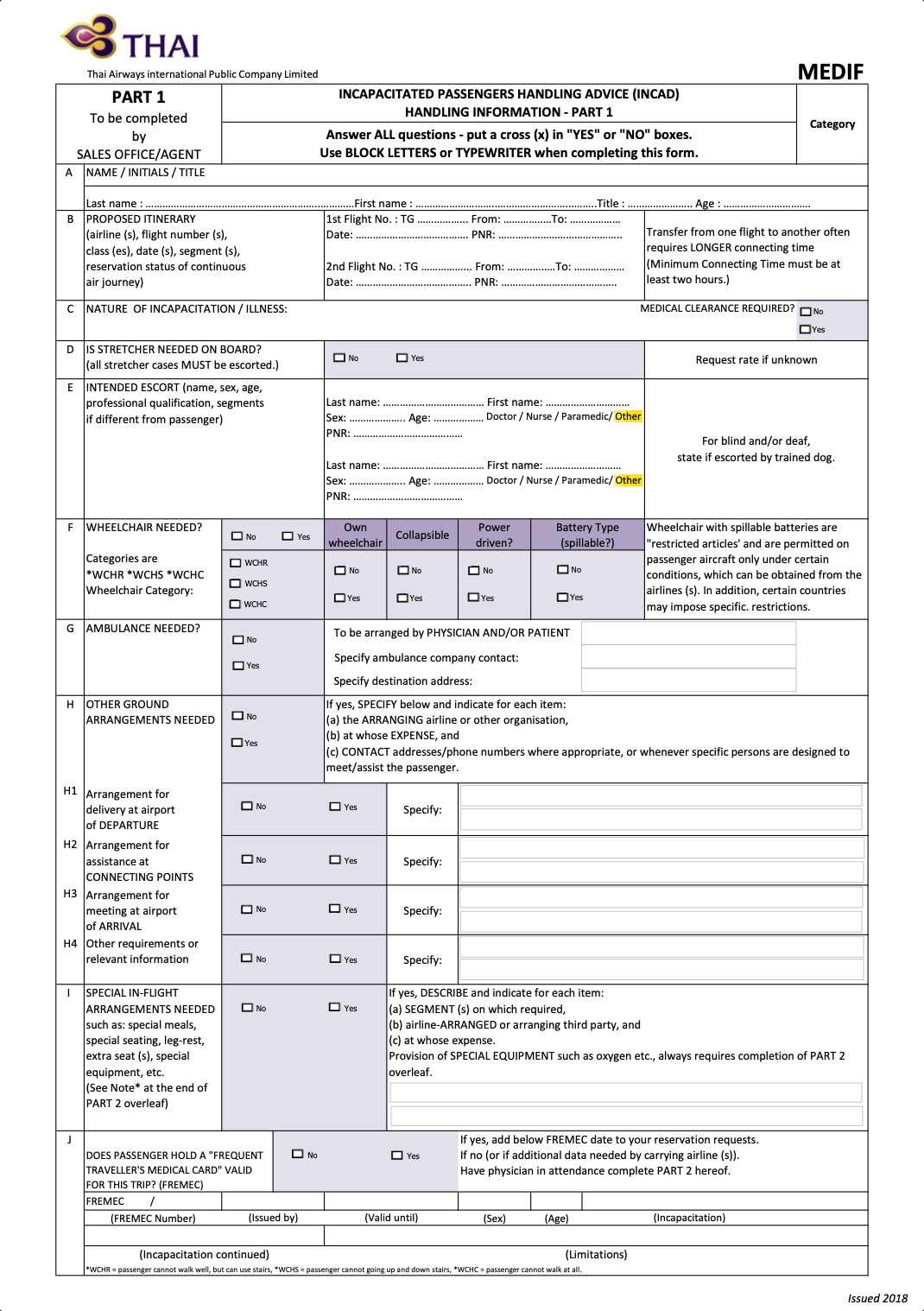 A MEDIF (medical information form) must be filled by your treating doctor to inform the details of the medical condition and if special equipment such as oxygen, a wheelchair or stretcher is required, THAI has the right to refuse, delay or ask to change travel conditions. Travelling by plane is permitted only for treated and stabilized patients.